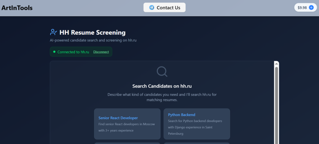 Недавно наши коллеги из ArtInTools сделали ии агент для рекрутинга. Он позволяет авторизоваться через аккаунт работодателя и выгрузить резюме по интересующим вас параметрам. Пожалуйста, протестируйте.